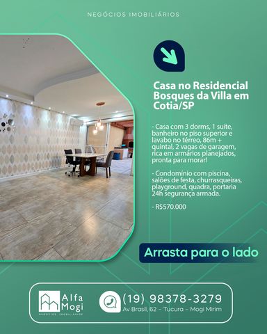 Casa no Residencial Bosques da Villa em Cotia Casa com 3 dorms, 1 suíte, banheiro no piso superior e lavabo no térreo, 86m + quintal, 2 vagas de garagem, rica em armários planejados, pronta para morar! Condomínio com piscina, salões de festa, churrasqueiras, playground, quadra, portaria 24h segurança armada. R$570.000 📱(11)985256199 entre em contato pelo WhatsApp e agende uma visita! Essa pode ser a casa que você procura para começar uma nova etapa✨