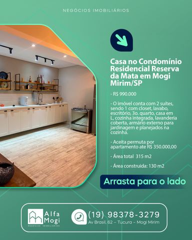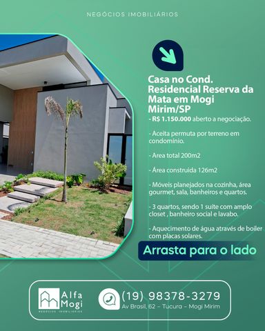 CASA À VENDA – CONDOMÍNIO RESERVA DA MATA MOGI MIRIM/SP Valor: R$ 1.150.000,00 Excelente oportunidade para quem busca conforto, sofisticação e lazer em um dos condomínios mais valorizados de Mogi Mirim. Imóvel moderno, com ótimo padrão de acabamento e projeto funcional. Características do imóvel: - Terreno: 200 m² - Área construída: 126m² - 3 dormitórios, sendo 1 suíte com amplo closet. . Riquíssima em móveis planejados na cozinha, area gourmet, sala, banheiros e quartos. Acabamentos de alta qualidade e bom gosto. .Área gourmet integrada a cozinha. Aquecimento de água através de boiler com placas solares. Localizada no Condomínio Reserva da Mata, que oferece segurança, tranquilidade e qualidade de vida para toda a família. Imóvel ideal para quem busca morar bem ou investir com segurança. Entre em contato para mais informações e agende sua visita. 📲 19989773557 Alfa Negocios Imobiliários CRECI 039311J